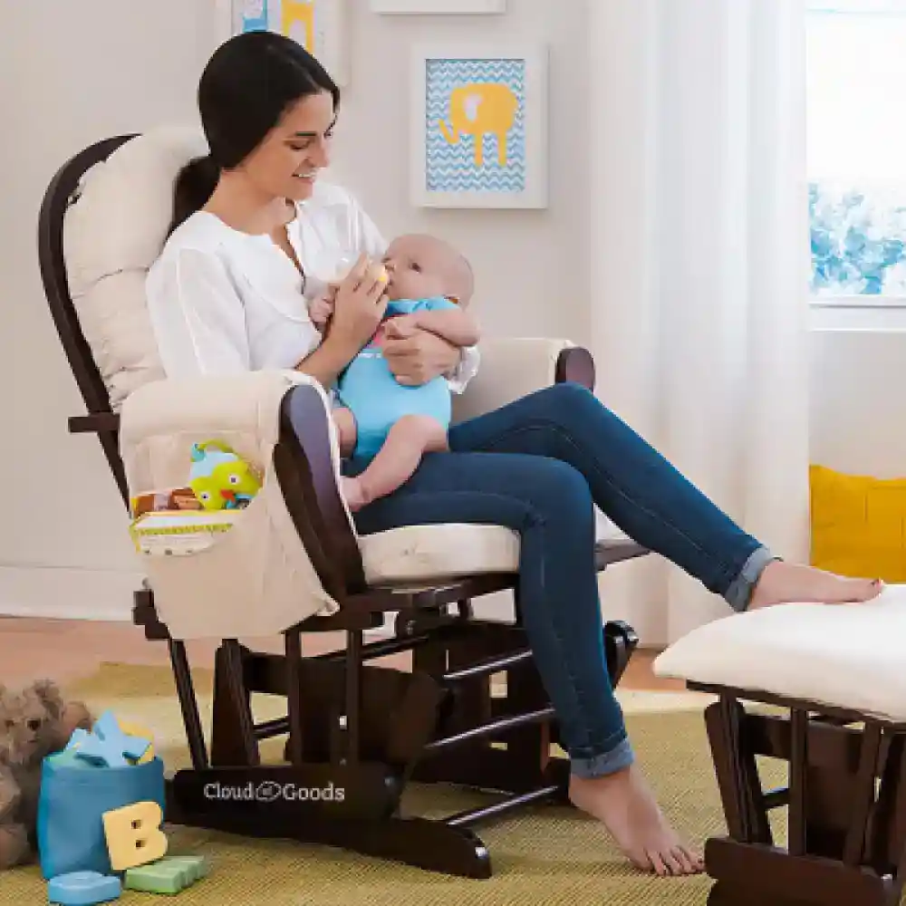 Glider rocking chair helps to soothe baby at nap time, feeding time or bedtime. The chair sits on a platform, and it glides forwards and backwards. Most new moms prefer gliding chairs to rocking chairs because they offer more stability, performance, and reclining features. This soft and cozy seat provides mom or dad with a cozy place to rest when they comfort their little one.