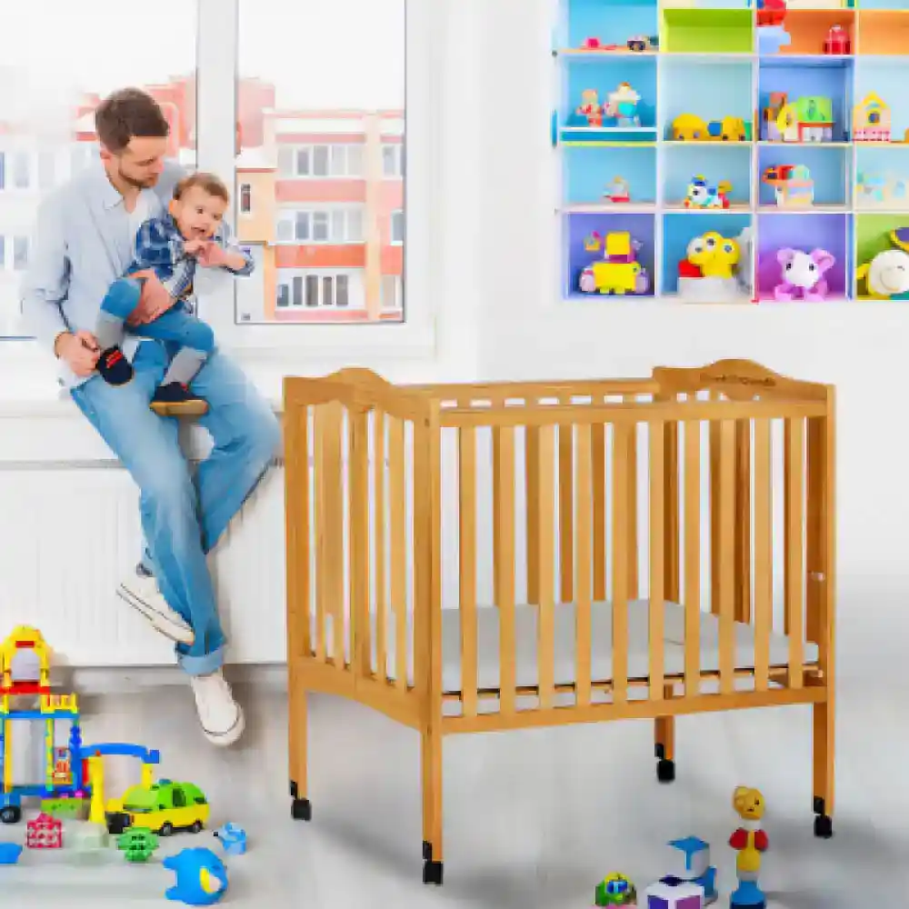 A wooden mini crib that folds easily and fits perfectly in smaller spaces such as hotels and condos. Great for little ones who prefer a bit more comfort than a pack ‘n play but do not require a full-size crib. Includes a 2-inch thick mattress that meets manufacturer safety recommendations and soft linens washed in hypoallergenic detergent. Crib dimensions: 39 x 25.2 x 39.5 inches