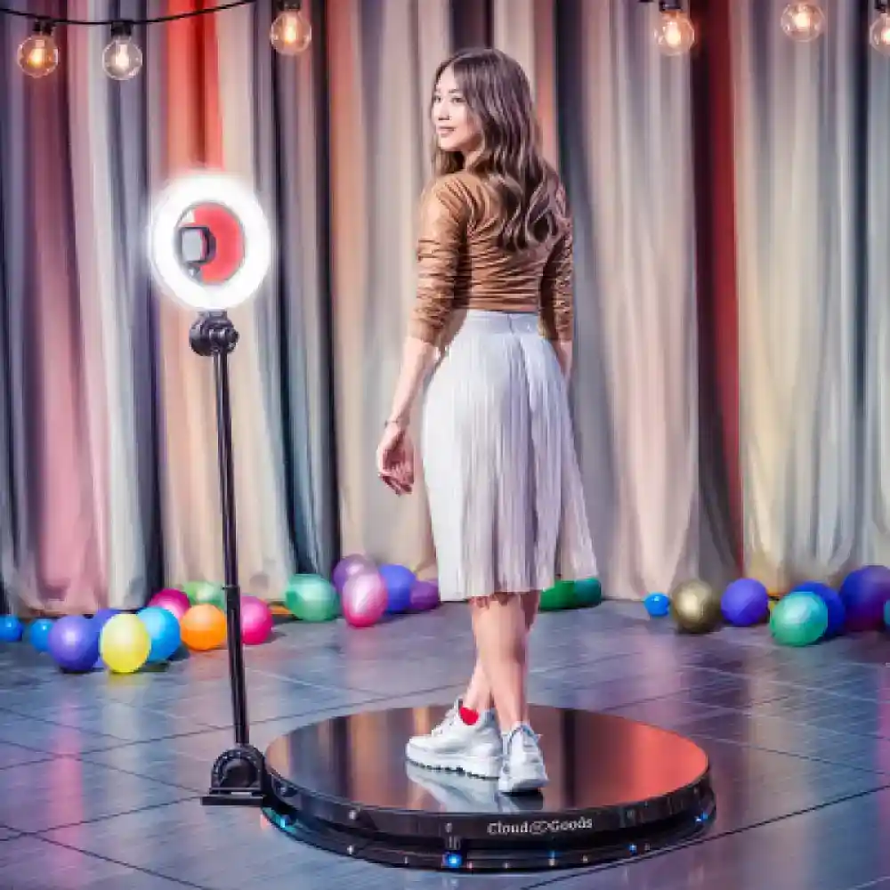 Capture every angle of your special moments with the cloud of goods 360 Photo Booth rental! Perfect for parties, weddings, and events, this booth lets you and your guests take stunning 360-degree photos. Simply step onto the platform, strike a pose, and the camera will spin around to capture amazing shots. Easy to set up and fun to use, the cloud of goods 360 Photo Booth will make your event unforgettable!