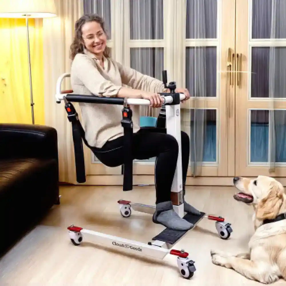 The Cloud of Goods Patient Lift Wheelchair is a special wheelchair designed to help people move easily and safely. It is perfect for those who need extra help getting in and out of bed, a car, or other places. The Cloud of Goods patient lift wheelchair rental for home serves multiple purposes, functioning as a bath chair, wheelchair, commode chair, and regular sofa chair to meet diverse needs. It provides an ideal solution for the elderly who struggle with independent toilet use and assists disabled individuals or patients in having a seamless bathing experience. The wheelchair has a strong frame and soft seat for comfort. It also has a lift mechanism that gently raises and lowers the user. The height of the seat cushion can be adjusted to accommodate various heights of toilets and sofas by changing the length of the seat cushion sling. Perfect for home care or hospitals. Rent it now for smooth and stress-free transfers!